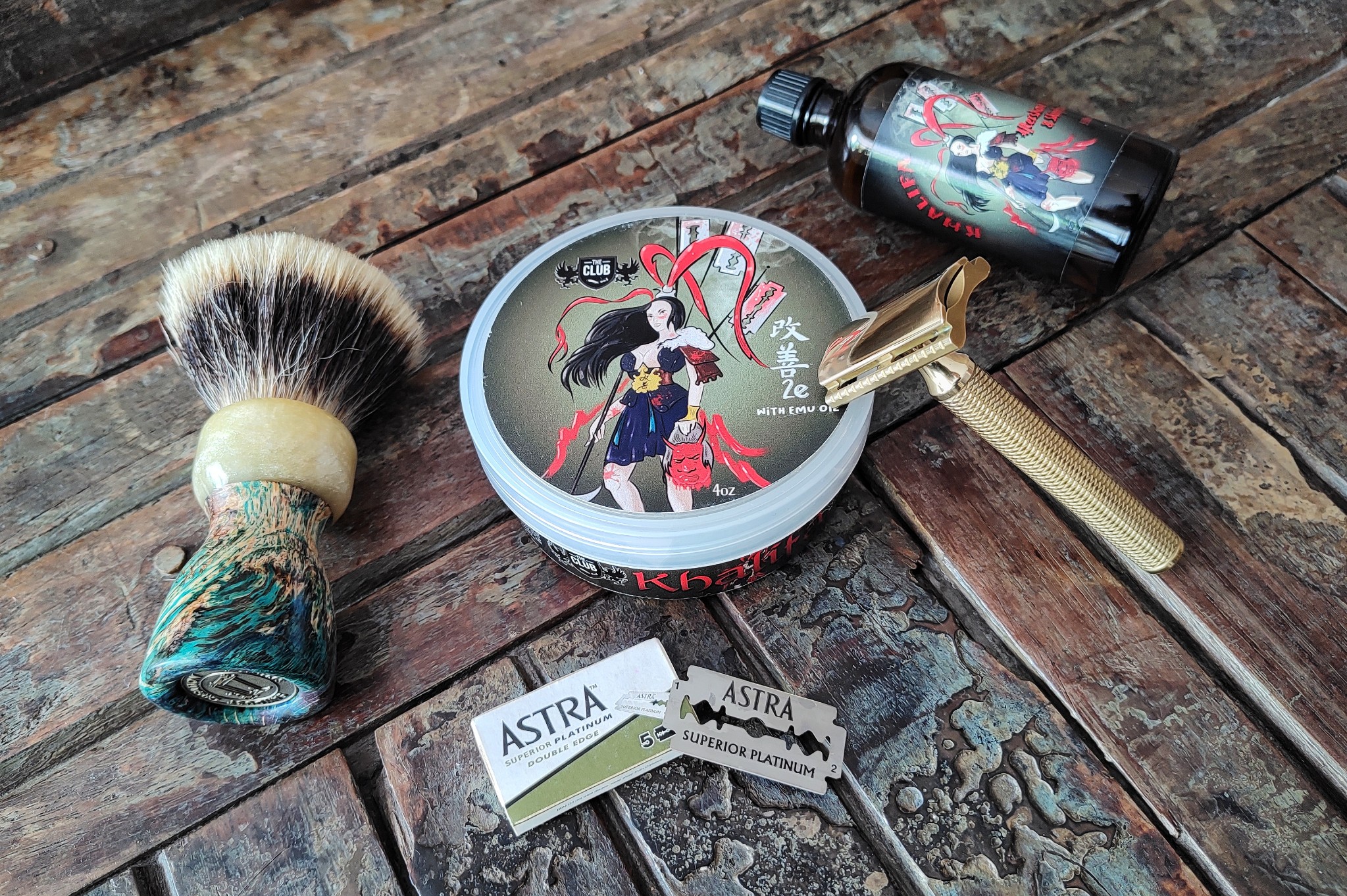 + Máquina: Christopher Bradley (base plate G) + Lâmina: Astra Superior Platinum (1) + Pincel: Sawdust Creation + Oumo two-band badger 28mm + Sabão: Ariana & Evans Khalifa + Pós-barba: Ariana & Evans splash (Khalifa)