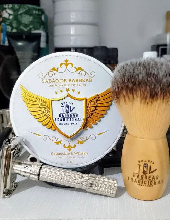 Barbeador: Gillette fatboy restaurada por Ruas Men's Grooming Sabão: Fórum Barbear Tradicional edição de 10 anos - capuccino whisky Loção: lavanda Ruas Men's Grooming Lâmina: king C Gillette Pincel: Fórum Barbear Tradicional 2023