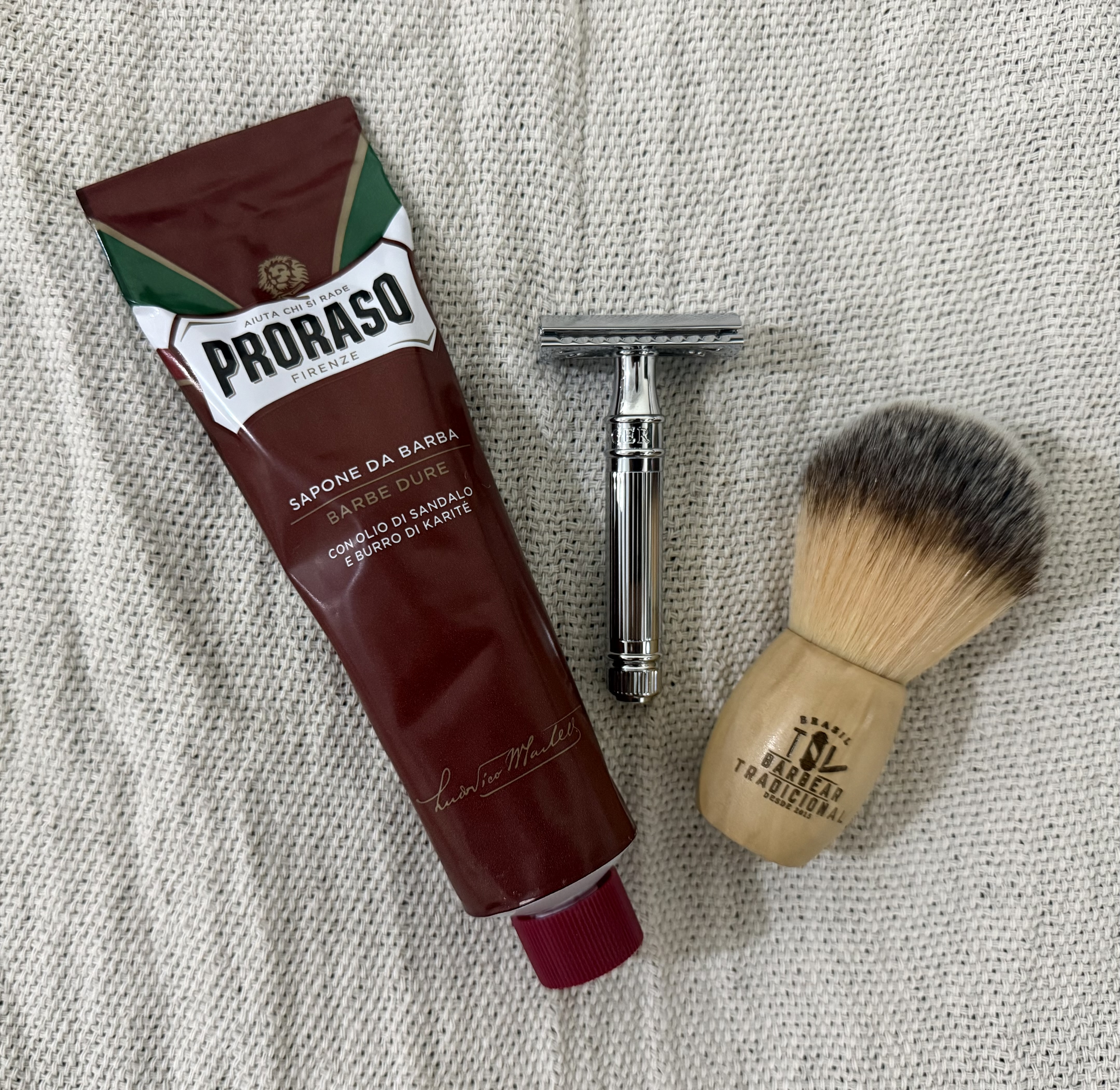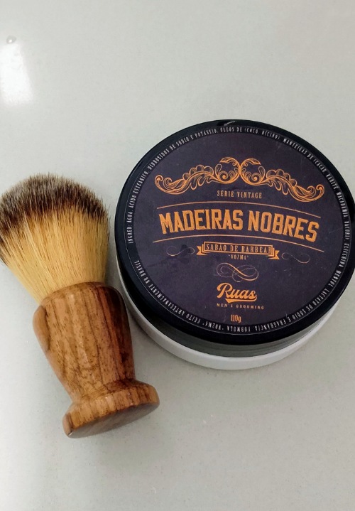 Barbeador: Gillette Aristocrat restaurado por Ruas Men's Grooming Pincel: Ruas Men's Grooming Classic 22mm sintético Loção: Lavanda Ruas Men's Grooming Lâmina Wilkinson Sabão: Madeiras Nobres Ruas Men's Grooming
