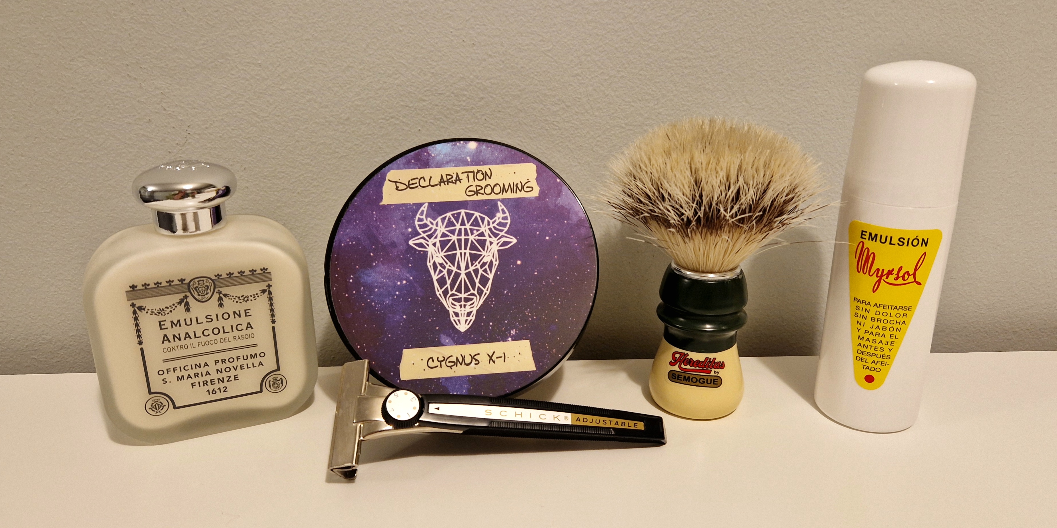 Música: Jarabe de Palo - La Flaca. Pré: Agua quente + Emulsión Myrsol. Pincel: Semogue 1305. Sabão: Declaration Grooming Cygnus X-1. Barbeador: Schick Adjustable. Pós-Barba: Emulsione Analcolica SMN. |
