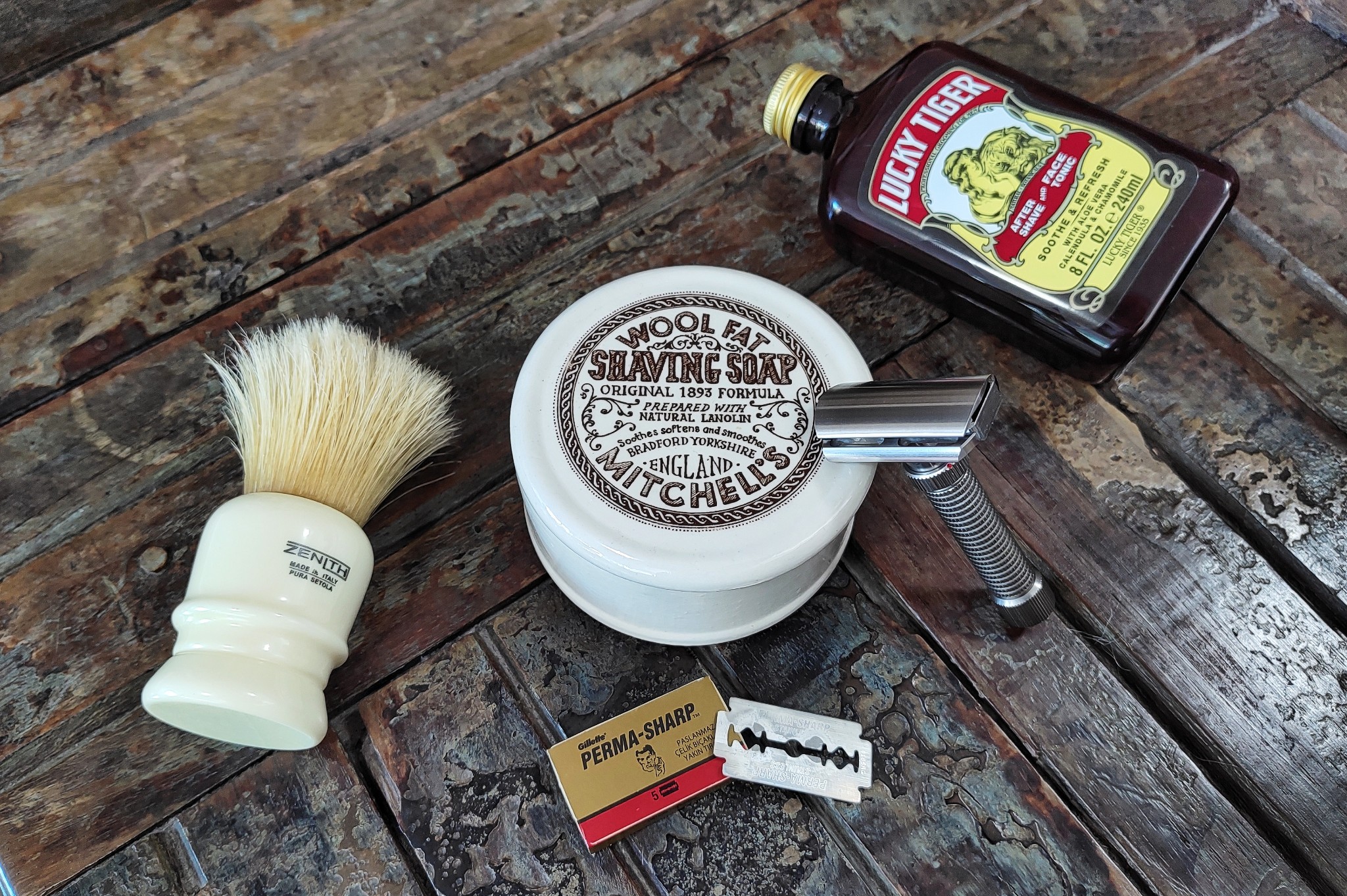 + Máquina: Rex Ambassador (5) + Lâmina: Perma-Sharp (1st use) + Pincel: Zenith boar 31mm + Sabão: Mitchell's Wool Fat (tallow) + Pós-barba: Lucky Tiger
