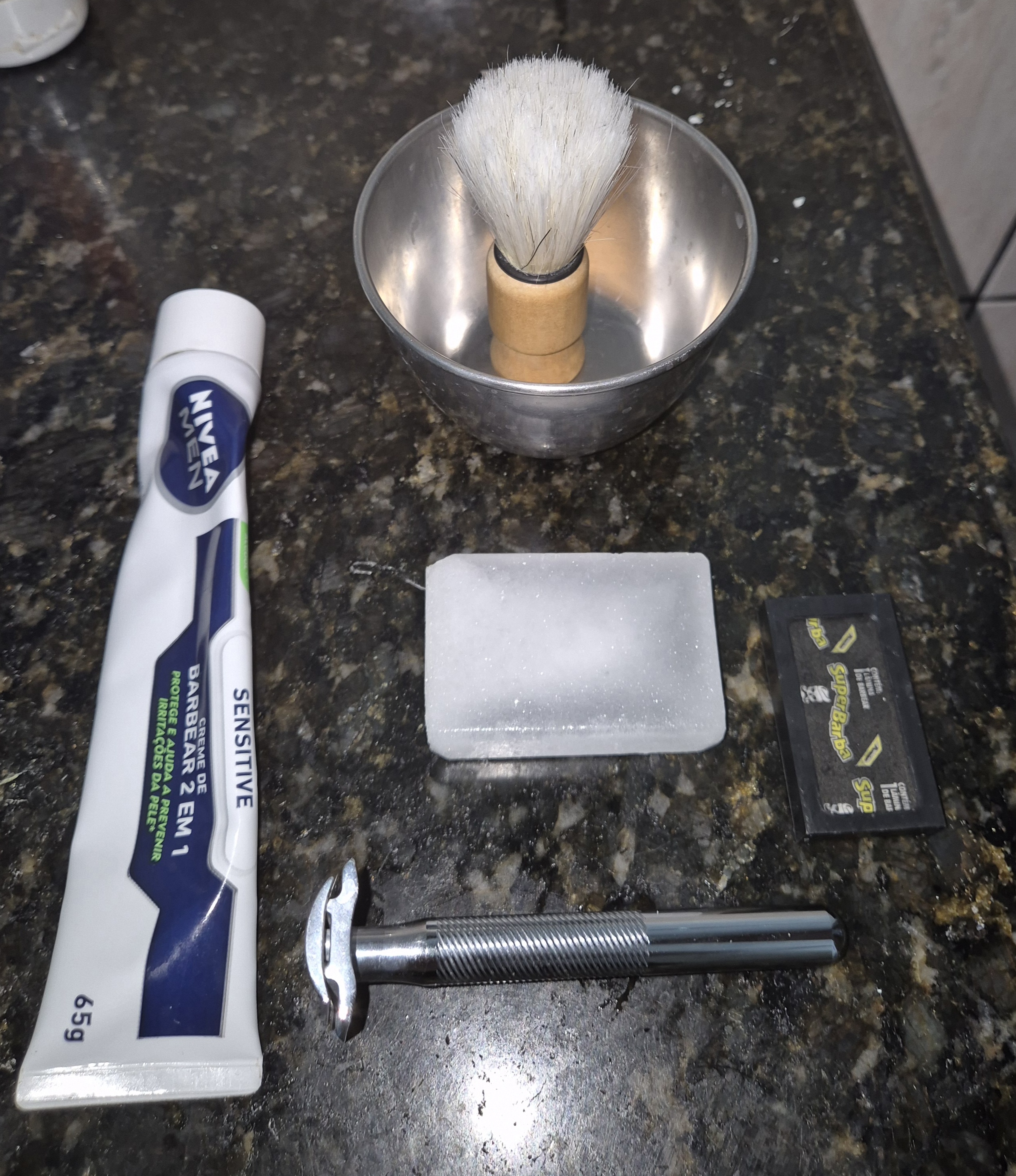 Adquiri minha King C Gillette no início do mês, e ao longo do mesmo consegui organizar esse "kit" inicial... à medida que for desenvolvendo minha técnica, pretendo buscar me "equipar" melhor.