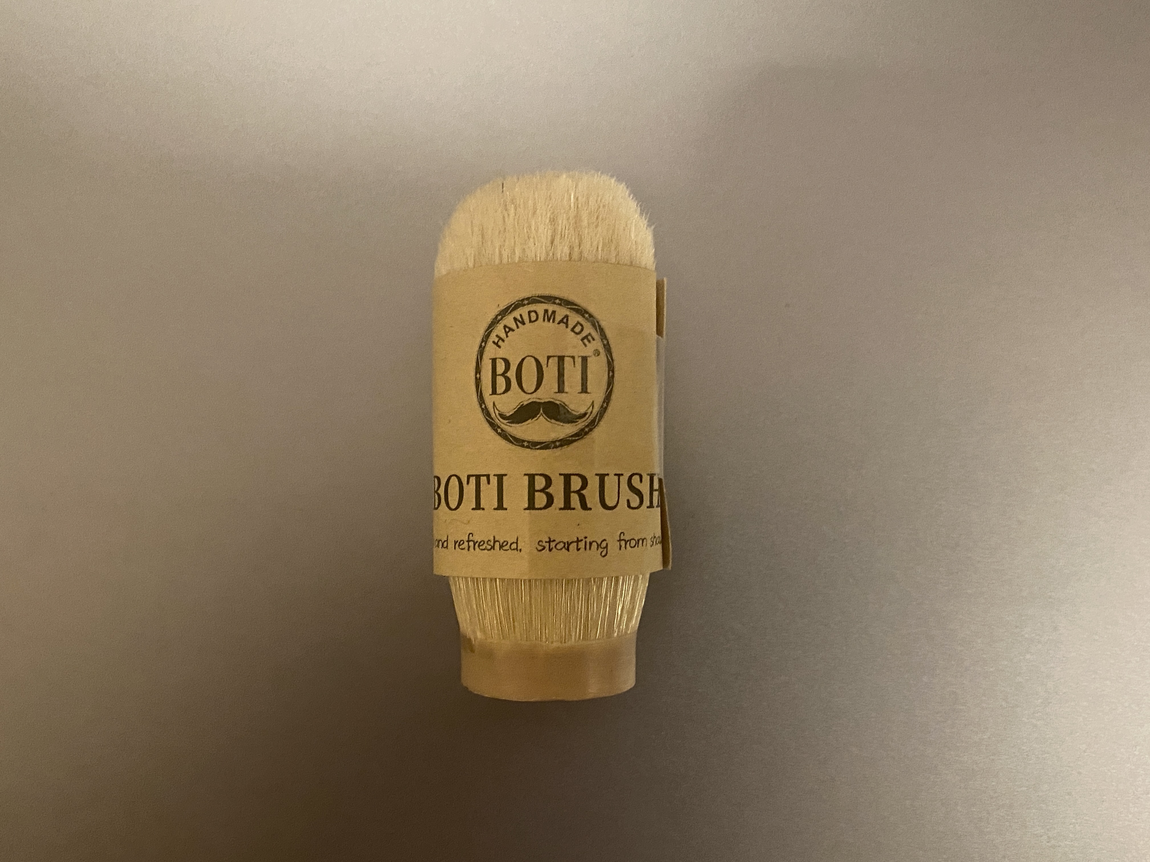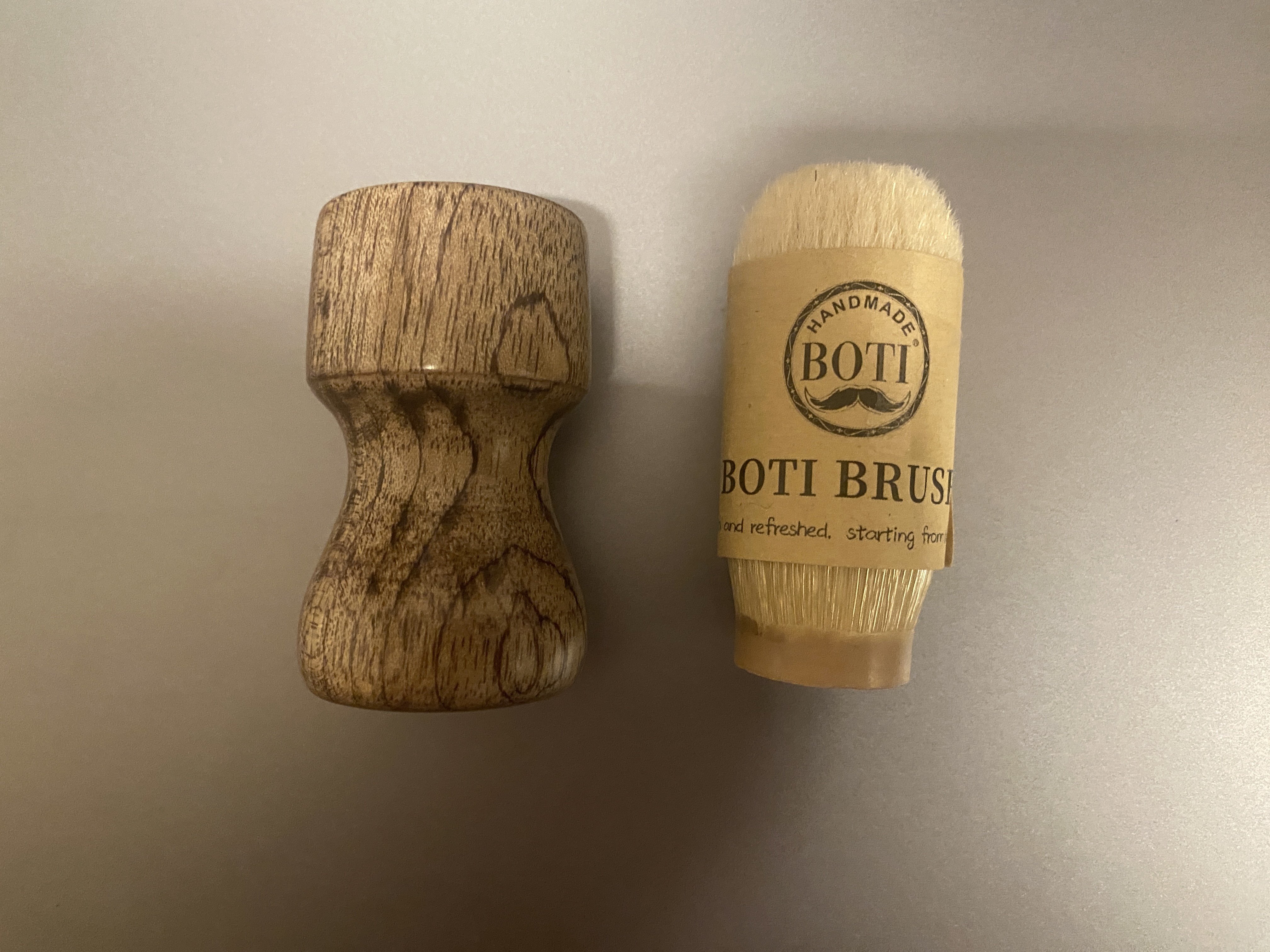 Pincel 24mm de madeira angelim vermelho com base produzida pela Ruas Mens Grooming e as cerdas de javali da Boti via AliExpress finalmente unidos.