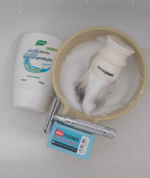 Creme de Barbear: Bozzano Pincel: Yaqi 24mm (cerdas sintéticas) Lâmina: Feather Pós Barba: Gel Max Proteção Sport Pharma Bowl: Dscosmetic